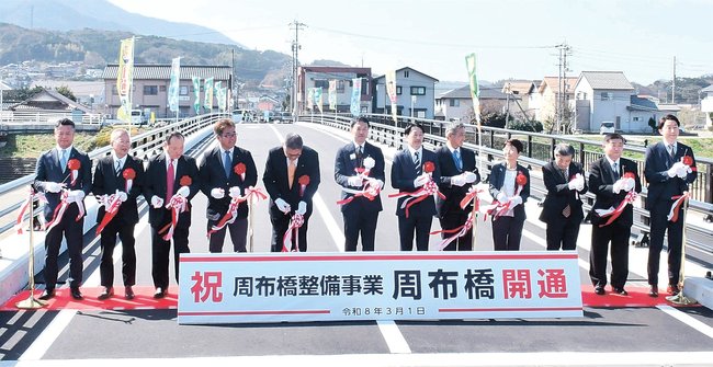 同市周布町の周布まちづくりセンターであった開通式には三浦大紀市長や地元住民らが出席した。周布地区まちづくり委員会の浜野佑紀会長(46)は「通院や買い物などがとても不便だった。橋の完成で日常の暮らしがより豊かになることを大変うれしく思う」と新しい橋の完成を喜んだ。