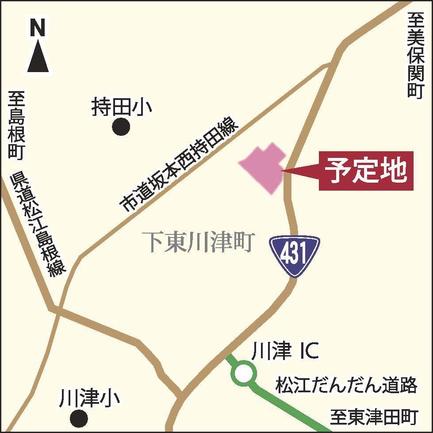 松江市下東川津町の国道431号川津バイパス沿いに、農地を転用した3・7ヘクタールの商業区域が開発される。周辺の住宅団地などからの集客を見込み、スーパーのみしまや(松江市雑賀町)など3店が来年3月ごろのオープンを予定する。