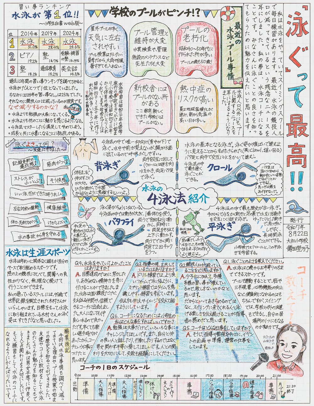 私は水泳をやっていて、泳ぐことが大好きです。最近、水泳人口が減って、中学総体の全国大会がなくなってしまうという、残念な話を聞きました。泳ぐことに興味がない人に、水泳の魅力を知ってもらいたいと思い、新聞を作りました。泳ぐって楽しいと思ってくれる人が少しでも増えるとうれしいです。
