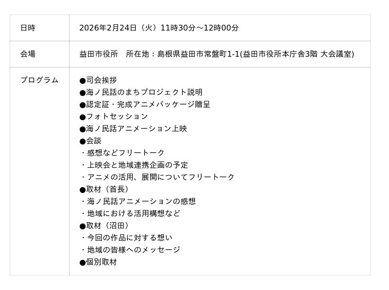 一般社団法人日本昔ばなし協会が取り組む「海ノ民話のまちプロジェクト」は、2026年2月24日(火)に島根県益田市を舞台にした海ノ民話アニメーション「高島のおイセさん」が完成したため、アニメ監督が益田市を訪問しアニメのお披露目と「海ノ民話のまち」認定式を実施しました。また、同日午後には、鎌手小学校で同作品の上映会イベントを開催しました。