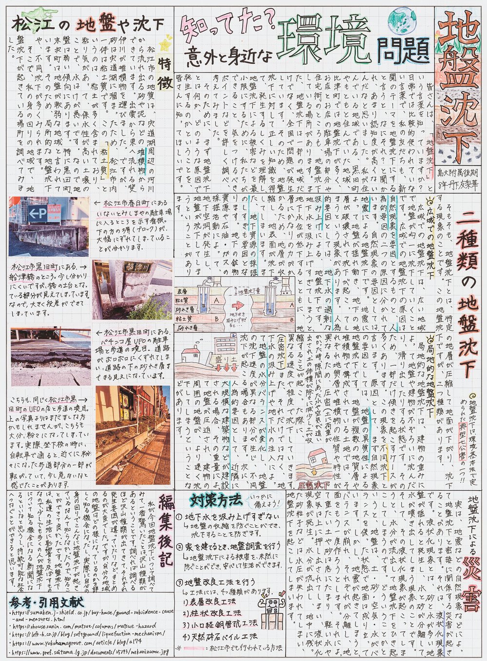 身近な環境問題である地盤沈下について、もっといろんな人に知ってもらえるといいなと思い、この新聞を作成しました。実際に地盤沈下が起きている場所を撮影して写真を載せたり、調べたことを誰が見てもわかりやすいような言葉でまとめたりすることを意識しました。皆さんにも、ぜひ身近な環境問題について調べてみてほしいです。