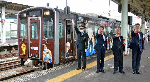 出発式には平井伸治知事とJR米子支社の佐伯祥一支社長、北栄町の松本昭夫町長が出席。平井知事は「コナン列車に出合い、山陰の旅を楽しんでほしい」と期待した。列車に乗り込んだ鳥取湖陵高校2年の稲村雫さん(16)は「キャラクターが全員かわいい」と喜んでいた。