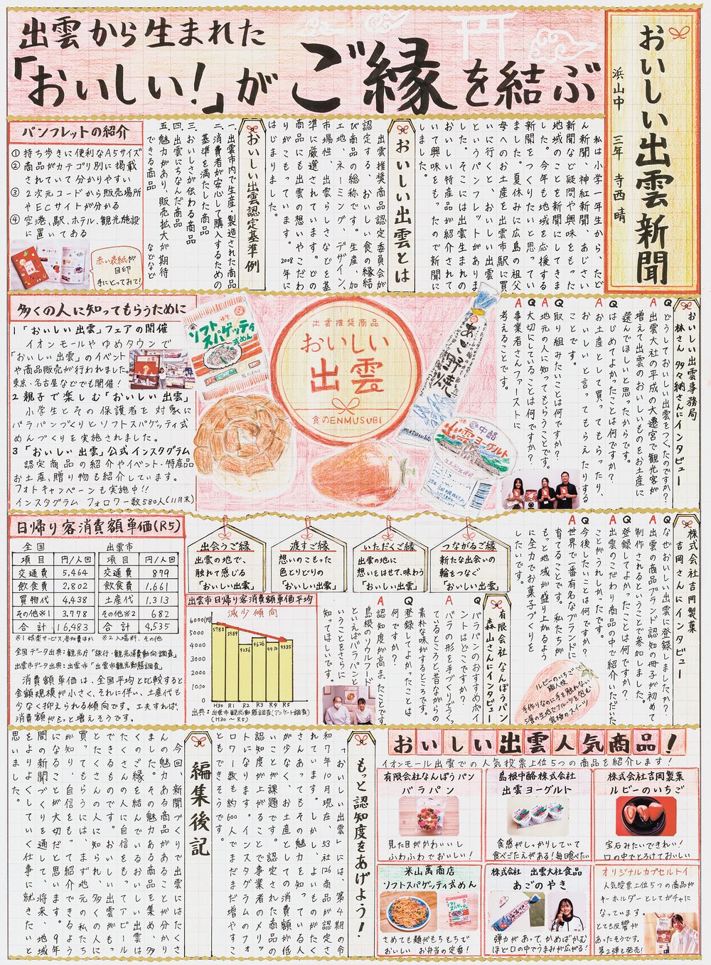 最優秀賞をいただき大変光栄です。小学1年生から始めた9年間の新聞作りを通して、島根の魅力をたくさん知ることができました。将来は地域をより良くする仕事に就きたいです。今回も出雲のたくさんのおいしいものに触れることができて楽しかったです。皆さんもぜひ、おいしい出雲の商品を買ったり、ガチャガチャをしたり、楽しんでください。