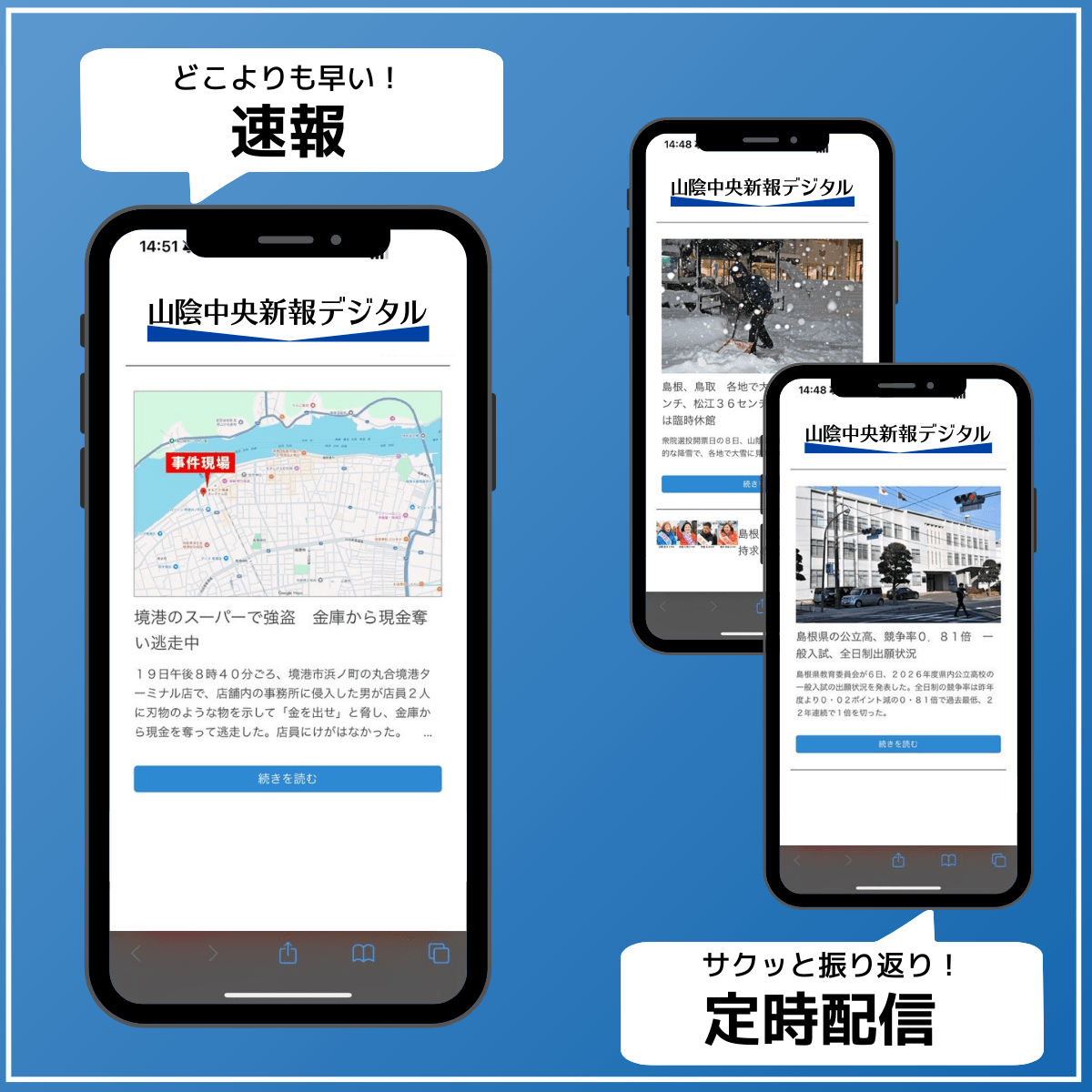 こんなメールが届きます 山陰を、もっと身近に。 どこよりも早い速報 お昼のニュース便 夜のまとめ便 1分読むだけで、山陰通。 お昼どき・帰宅時の新習慣。 編集部が厳選した「今、知るべき山陰」を毎日2回お届け。大きな事件・事故の速報もリアルタイムで届きます。 無料で登録する 📢 どこよりも早い速報 重大な事件・事故、発表などを、メールで即座に通知します。 🍱 お昼のニュース便 ランチのお供に。午後の会話の題材になる地元の話題を厳選して配信。 🌙 夜のまとめ便 帰宅時間に。その日の山陰の動きをサクッと1分で振り返れます。 こんなメールが届きます 山陰を、もっと身近に。 メールアドレスだけで、今すぐ始められます。 無料で登録する