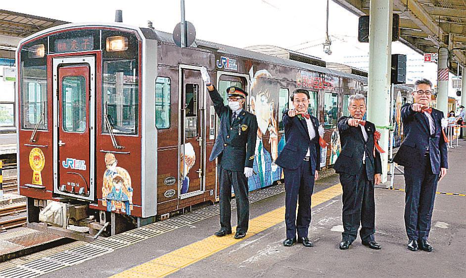 【鳥取】鳥取県北栄町出身の漫画家、青山剛昌さんの人気作「名探偵コナン」のキャラクターが描かれた「コナン列車」のうち、1タイプのデザインが一新され、鳥取市東品治町の鳥取駅で18日、出発式が開かれた。主にJR山陰線鳥取-米子駅間の快速列車として運行する。