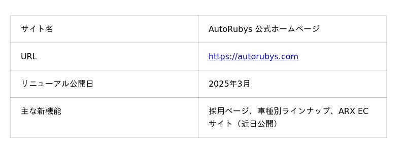 鳥取県鳥取市に本社を置くカスタムカーパーツメーカー・AutoRubys(オートルビーズ、代表:野澤 慎吾)は、2026年3月、公式ホームページを全面リニューアルしたことをお知らせいたします。