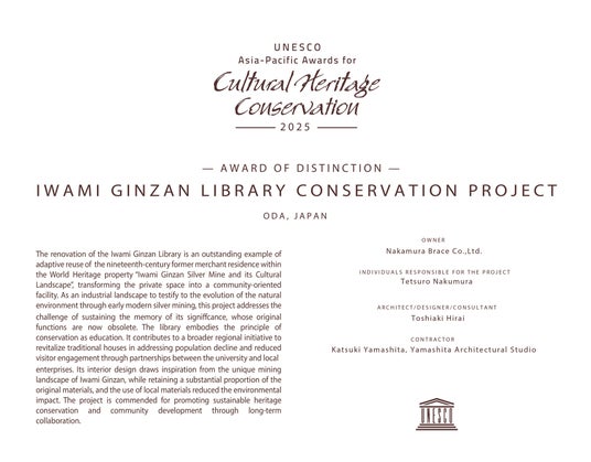 2026年2月、島根県立大学・島根県立大学短期大学部サテライトキャンパス「石見銀山まちを楽しくするライブラリー」は「2025年 ユネスコ・アジア太平洋文化遺産保全賞(2025 UNESCO Asia-Pacific Awards for Cultural Heritage Conservation)」において、「最優秀賞(Award of Distinction)」を受賞しました。