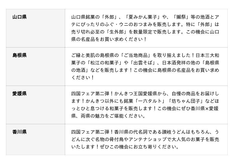 2026年3月は16日(月)~19日(木)に、山口県・島根県・愛媛県・香川県の名産品が出展されますので、お知らせします。
