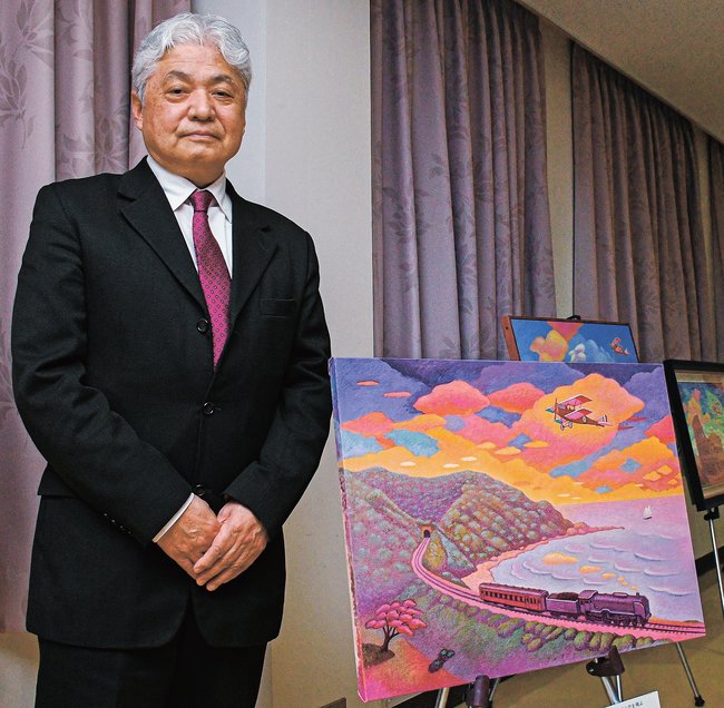 106年前に欧州から日本へ初飛来し、島根県の上空も通過した小型飛行機を題材にしたイタリア在住の画家・道原(どうばら)聡さん(66)の油彩画展が7、8の両日、広島県三原市であった。三隅海岸(浜田市)の空を飛ぶ機体などを描いた25点を展示し、道原さんのトークショーもあり、来場者は解説を聞き、作品に見入った。