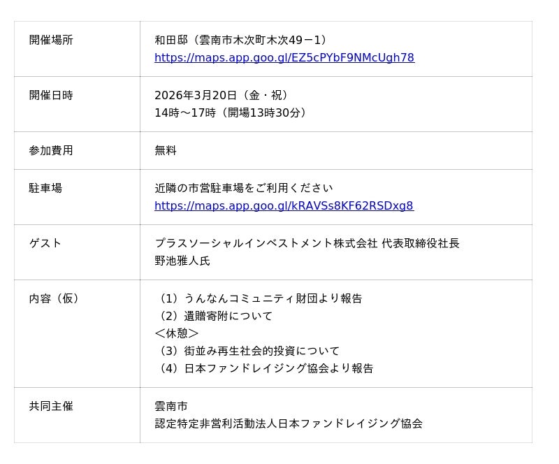 公益財団法人うんなんコミュニティ財団(島根県雲南市木次町 代表理事:郷原剛志)は、「うんなんコミュニティ財団5周年報告&新しいお金の流れえすこ会議」を2026年3月20日(金・祝)14時から開催します。