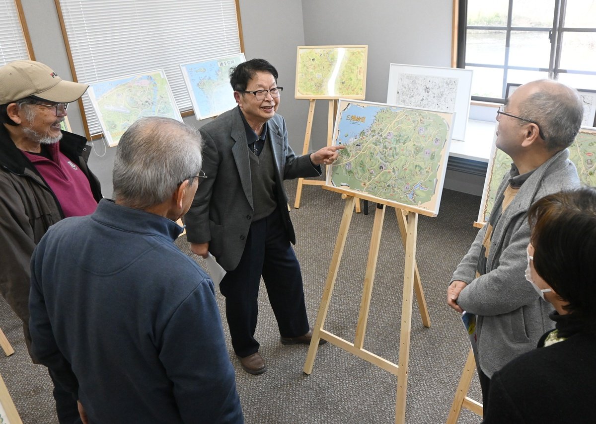益田市内の史跡や文化財など歴史にまつわる場所のイラストを詰め込んだ絵図を紹介する「益田絵図展」が14日、同市本町の歴史文化交流館・れきしーなで始まった。展示を通して町の魅力や歴史を発見してもらう。入場無料、15日まで。