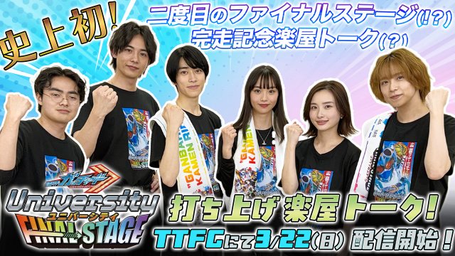 「仮面ライダー」テレビシリーズ史上初、1年間を通して放送された『仮面ライダーガッチャード』の「シーズン2」となる『仮面ライダーガッチャード University』。そのラストを飾るのは史上初となる2度目のファイナルイベント『仮面ライダーガッチャード University ファイナルステージ』。その大千穐楽を終えたばかりの興奮冷めやらぬキャストの本島純政、松本麗世、藤林泰也、安倍乙、富園力也、加部亜門の6人が、楽屋からお届けするスペシャルアフタートークの配信、という仮想の設定を基にして企画されたスペシャルコンテンツを、東映特撮ファンクラブ(TTFC)で22日から会員見放題配信となる。