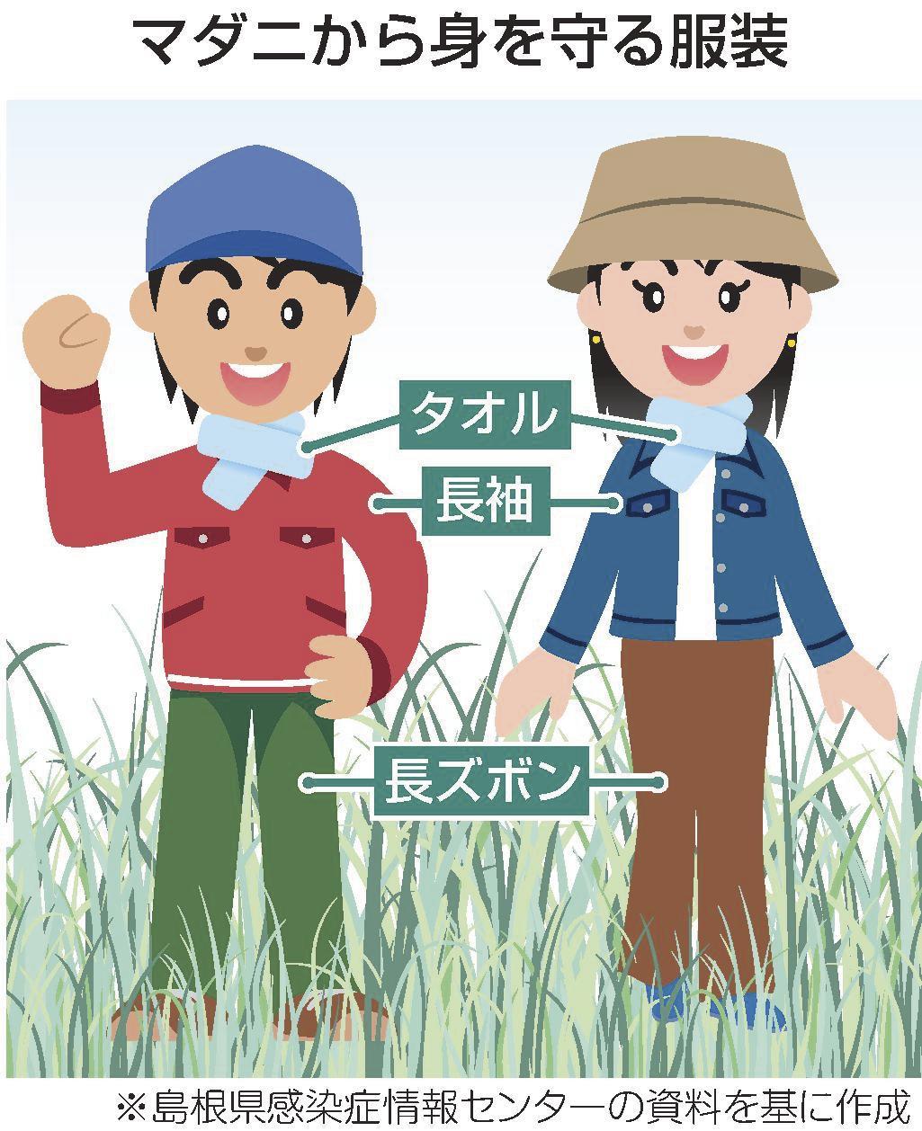 島根県内で「重症熱性血小板減少症候群(SFTS)」と「日本紅斑熱」の患者報告数が増加傾向にある。どちらもマダニにかまれることで感染する。森林や草むらなどマダニが生息する場所に入るときは肌の露出を減らし、かまれないよう予防することが重要だ。 (大迫由佳理)