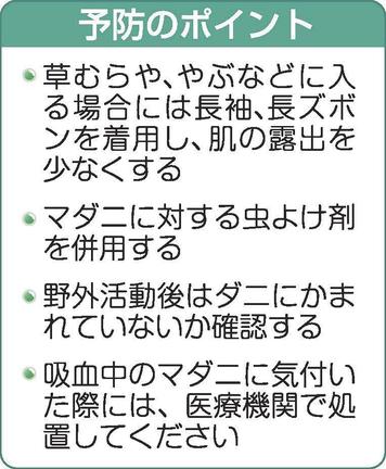予防法はかまれないよう、対策を取るに尽きる。野山や田畑に出掛けるときは、長ズボン・長袖を着て、手袋や帽子なども利用して肌の露出を減らし、マダニに効く防虫スプレーも併用する。帰宅後は体をはたいてマダニを払い、上着や作業着などは家の中に持ち込まないようにする。すぐに入浴し、吸血されていないか確認することも大切だ。かまれたときは無理に自分で取ろうとせず、皮膚科を受診して除去してもらう。