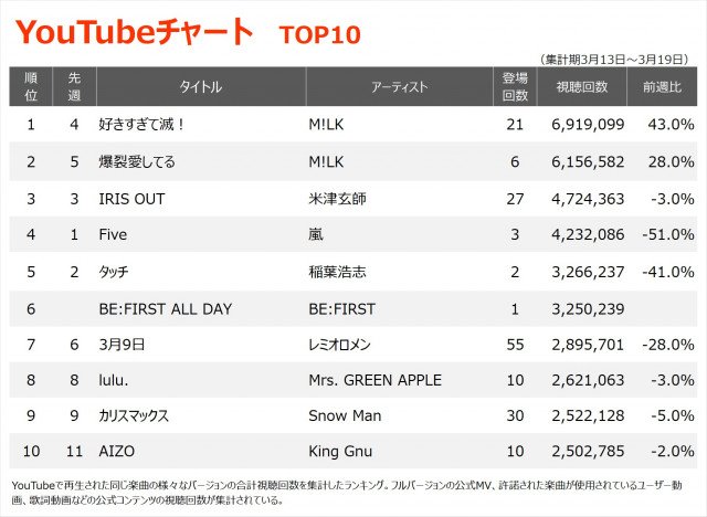 M!LKの「好きすぎて滅!」(691.9万回)が2週ぶりに1位に返り咲き、通算3度めの首位となった。2位(前週5位)は「爆裂愛してる」(615.7万回)で、M!LKは2月18日にリリースした両A面シングル「爆裂愛してる/好きすぎて滅!」の収録曲2曲が6週連続で同時TOP10入り。その勢いは増すばかりだ