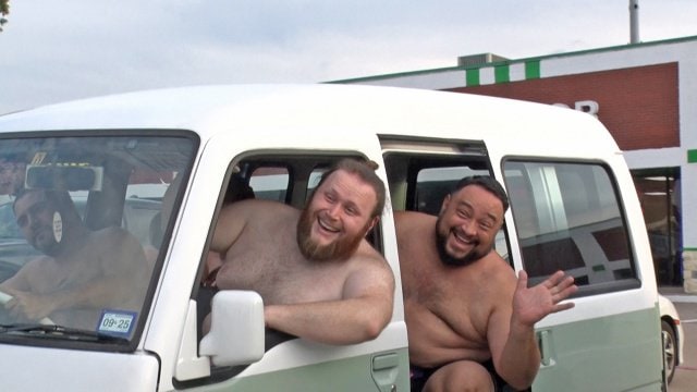 さらに車を見て回るうちに、案内役が「やばいこと起きてるんだけど!」と、『サンバー』の方を指さし、見てみると、謎の力士軍団が登場。『サンバー』に乗り込んだこの軍団とは。