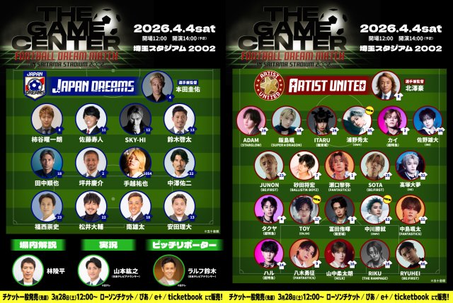 同イベントは4月4日に埼玉スタジアム2002にて開催される。事務所の垣根を越えた豪華アーティストが集結し、このイベントならではのドリームマッチが実現。サッカーとライブ、バラエティ企画が融合した構成で実施予定だ。