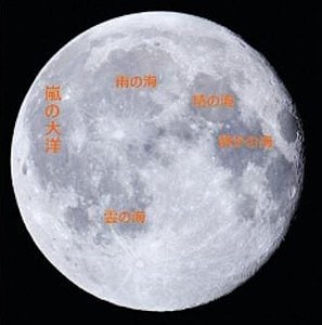 月の海には「静かの海」「晴(はれ)の海」などの名前がついています。そんな中に「嵐(あらし)の大洋(たいよう)」と呼ばれる海があります。場所は「ウサギのもちつき」でいえば、ウサギの後脚(うしろあし)か、うすの下の部分あたりでしょうか。太平洋のように「洋」とつくのは、それだけ広いことを意味しています。端(はし)から端まで約2600キロで、面積だと日本海の2倍ほどあります。月で最大の海です。