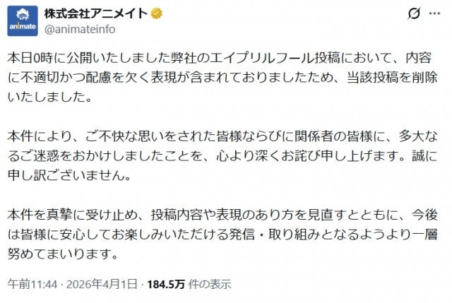 アニメイトは1日、公式Xを更新。本日1日午前0時に公開したエイプリルフールのネタ投稿において不適切な表現があったことを謝罪した。