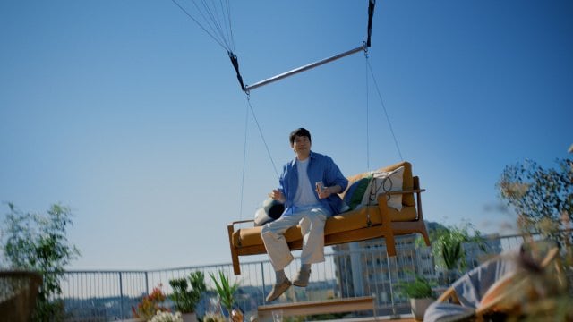 ソファーごと浮き上がるシーンは、専門家の指導の下、安全性に十分配慮しながら、大掛かりな仕掛けを用いて撮影が行われた。屋上テラスでの撮影では、ハーネスを着用した松山をワイヤーでトラス(仕掛けや人物などを固定するために使用する金属製の構造物)に固定。ソファーも別のワイヤーでトラスに固定し、滑車などを使いながら、スタッフ数人がかりでつり上げるという手法で撮影した。本番前、「(浮上中は)何もしゃべらなくていいですよね」と尋ねた松山に対して、監督は「できれば、ちょっとしたニュアンスがほしいです」と回答。それを受けて、「おぉ~!」「どこへ行くのかな?」とアドリブを入れた松山は、「あははは、なんだこの絵(笑)」「面白いなぁ」と楽しそうに笑いながら、自身のプレイバック映像を確認した。
