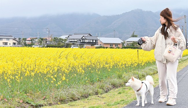 3月31日、地元の住民が足を止めて花に見入っていた。同町荘原の会社員藤井穂乃香さん(27)は「昨年初めて見て、今年も見たいと思っていた。春が来たなあって感じる」と一面を見渡し、愛犬の豆柴、むぎちゃん(2歳雌)と散歩を楽しんでいた。