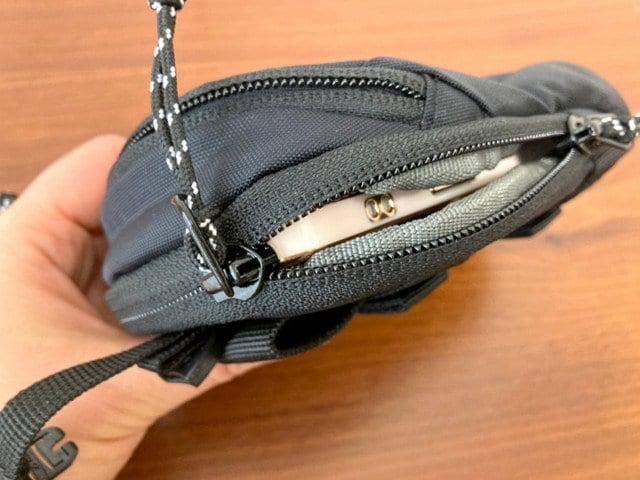 大きさはケースに入れた6.1インチのスマートフォンが楽に収納できるほど。財布や行動食、定期、鍵などを入れてもよさそうだ。