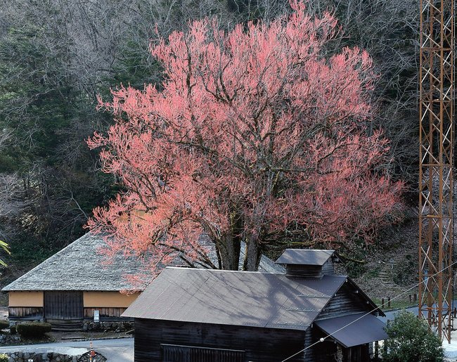 雲南市吉田町吉田の菅谷たたら山内で、たたら製鉄が操業されていた高殿の近くにあるカツラの木が満開を迎えている。製鉄の炎のような赤い花が来訪者を魅了している。見頃は5日ごろまで。