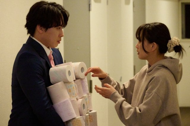 一方、アルバイト初日、エレガントなスーツ姿に身を包み、律儀に手土産を持ってやって来たエータのチグハグさやラストには、メインビジュアルの壁穴の謎が明らかになる問題のシーンが登場。記者会見でも話題を呼んだ、右腕を抑えるエータポーズも披露された。
