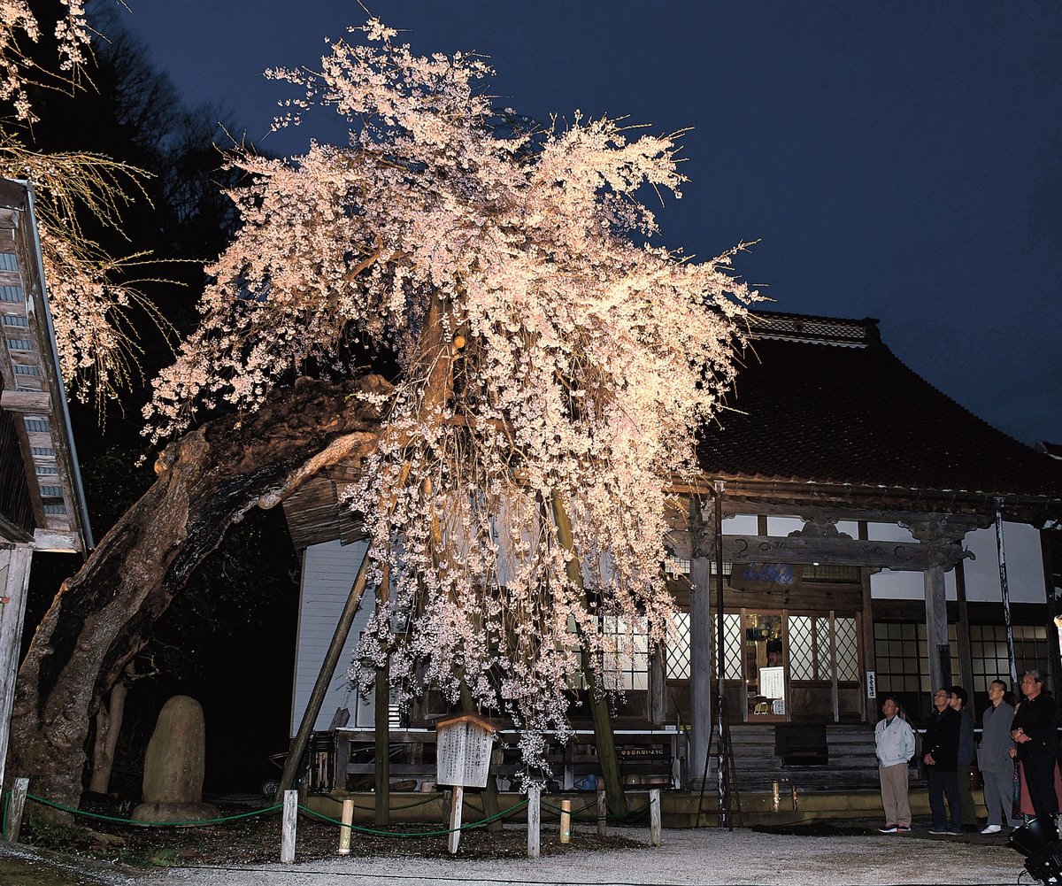 藤井哲眞住職(58)によると、以前から地元住民にライトアップしてはどうかと提案されていたという。4日に満開になった巨木のしだれ桜を見て思い立ち、ライトを近隣から借りた。