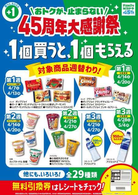 ファミリーマートは、今年9月に創立45周年を迎える。今回「いちばんちょっとおトク」を目指した取り組みの一環として、飲料・チキン・パン・おむすびなど、さまざまな商品で生活を応援する「45周年大感謝祭」を全国のファミリーマート約1万6400店で開催する。