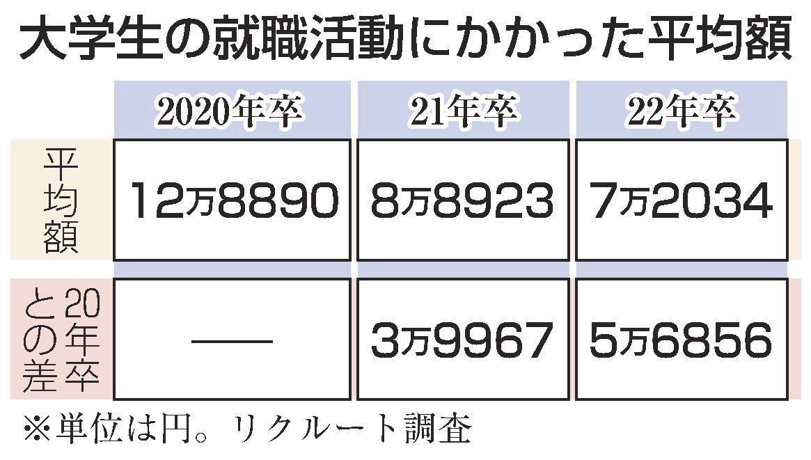 2022年卒業予定の大学生がこれまでに使った平均の就職活動費が、新型コロナウイルス感染拡大前の20年卒の同時期に比べ4割ほど減少し、約7万2千円となったことが23日、民間調査で分かった。オンラインによる就職活動が増え、交通費や宿泊費が大きく減ったことが要因という。