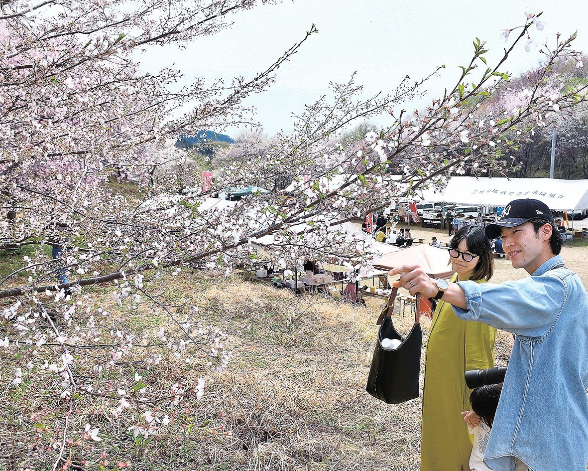 【大田】6千本の桜が見頃を迎えた大田市三瓶町の上山地区で12日、恒例の三瓶さくら祭りがあった。訪れた約3千人が、白やピンクに色づいた桜の下で花見を楽しんだ。