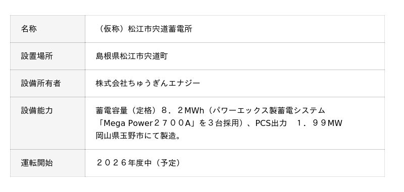 基本合意書によって4月より着工となる「(仮称)松江市宍道蓄電所」は、2026年度中に運転開始を予定しております。本件はちゅうぎんエナジーによる蓄電池事業における第1号案件であり、さらにパワーエックスにおいても地方銀行グループが所有する系統用蓄電所を運用する初めての案件であります。今後も共同で蓄電池活用による地産地消型エネルギー利用の拡大を推進し、再生可能エネルギー拡大に一層貢献してまいります。