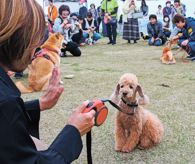 ペット同伴の「ペットマルシェ」が19日、浜田市三隅町折居の道の駅・ゆうひパーク三隅であり、愛犬家らが「待て」と指示した犬が耐えられるかどうかや、飼い主と犬の歩き方を競う種目などを楽しんだ。
