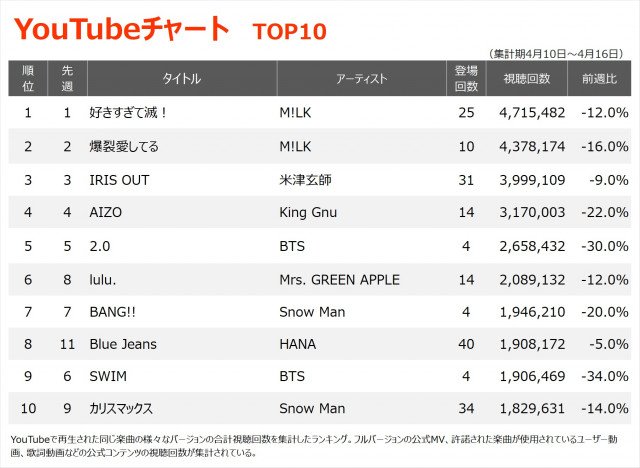 2026/4/10-4/16のYouTubeチャートTOP100の週間総視聴回数は前週比12.5%減、TOP100の初登場作は15作(前週10作)となった。