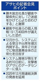 アサヒ 191万件漏えいか 個人情報、サイバー攻撃で 社長謝罪、12月から復旧へ