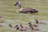 カルガモ親子、今年初めて確認 親の先導に合わせ10羽スイスイ 米子水鳥公園