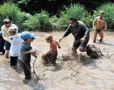 園児とレスラー泥んこ 鳥取の休耕田活用しイベント