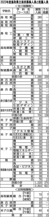 鳥取県立高全日制3844人 22年度 募集定員変わらず