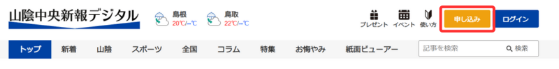 山陰中央新報デジタル(https://www.sanin-chuo.co.jp/)のトップページ画面右上の「申し込み」をクリックします。