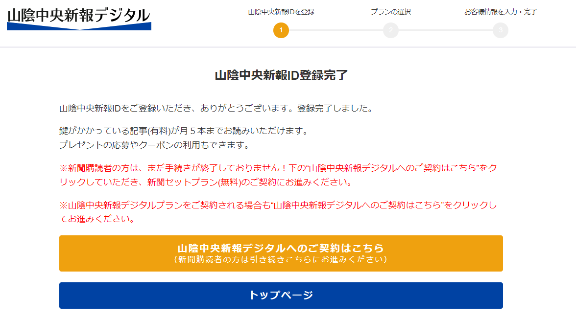 下記の表示に変わると、無料会員(山陰中央新報ID)に登録完了です。