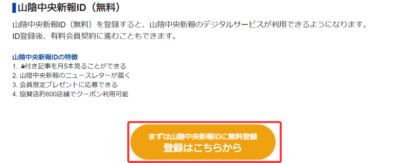 山陰中央新報ID・プランの紹介ページ(https://www.sanin-chuo.co.jp/list/sdigi/top)にある「登録はこちらから」をクリックします。