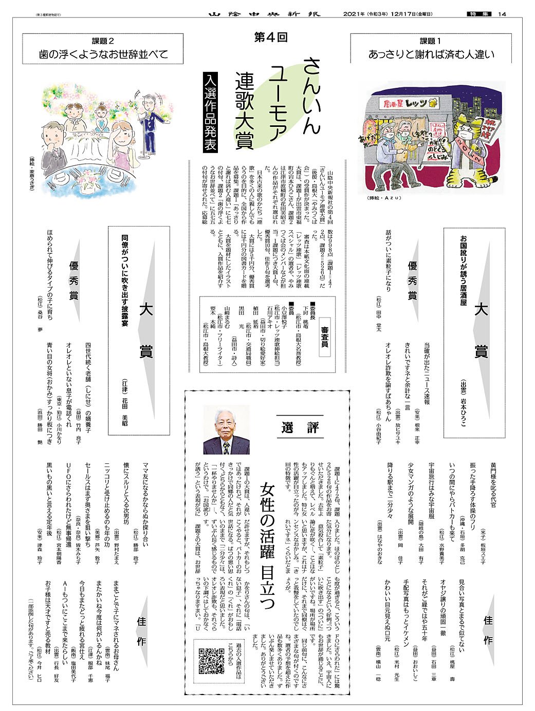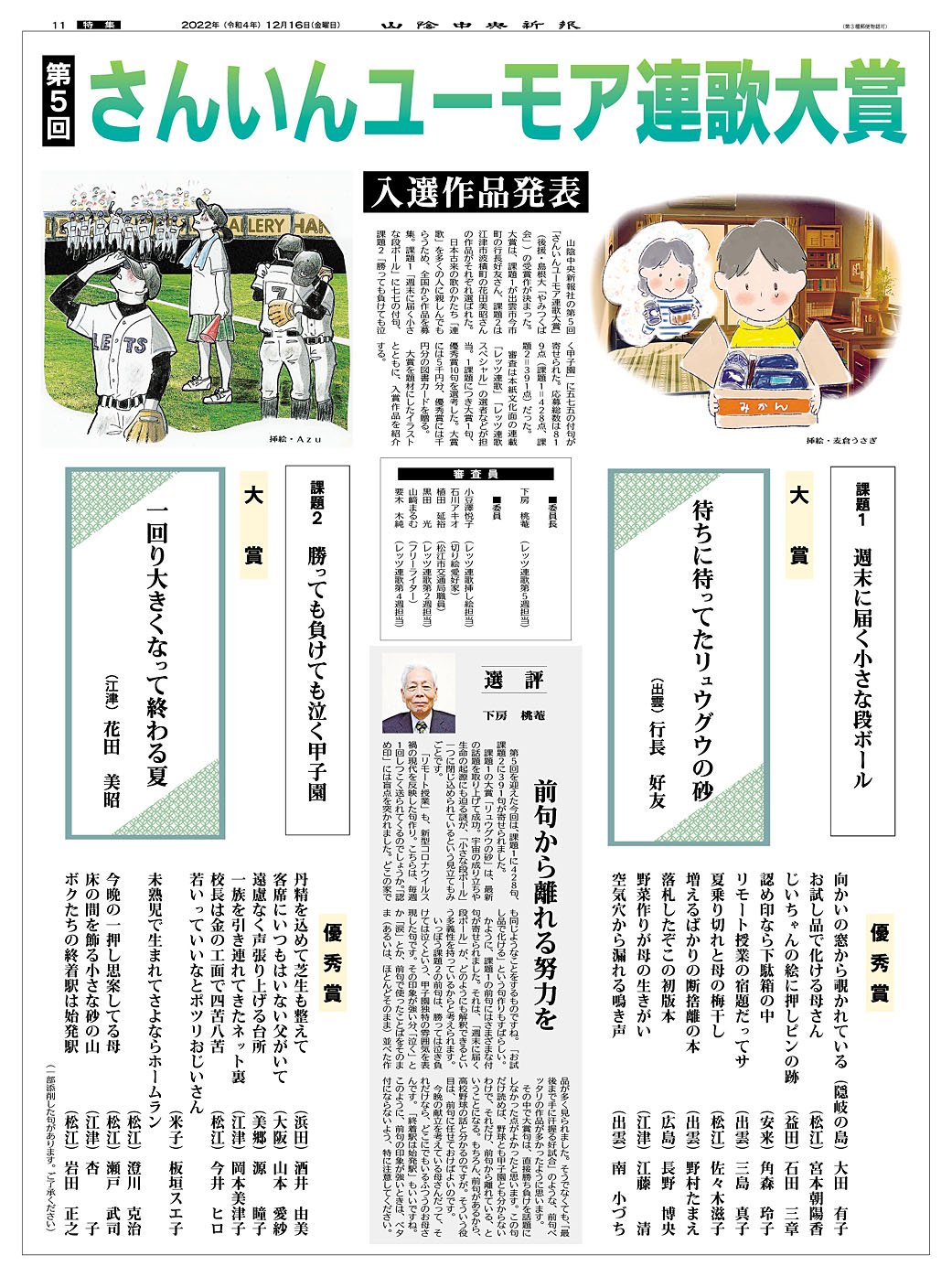 日本古来の歌のかたち「連歌」を多くの人に親しんでもらおうと、山陰中央新報社が作品を募集している「さんいんユーモア連歌大賞」(後援・島根大「やみつくば会」)。