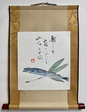 裏打、軸付けなどは講師にお任せいただき、後日、完成品をお渡しいたします。仕上がりサイズ:縦約50㎝×横約32㎝(軸幅約37㎝)