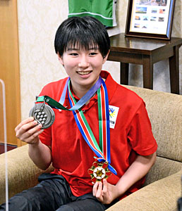聴覚障害者の国際スポーツ大会「夏季デフリンピック競技大会」(5月)の卓球女子団体に日本代表として出場した山田萌心(もえみ)(益田中)が銀メダルを獲得した。 |