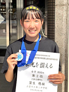 全国中学校体育大会(8月)の陸上女子800メートルで蒲生悠桜(出雲三)が中学山陰記録(2、3年)を塗り替える2分10秒95をマークして準優勝した。 |