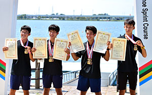 高校・カヌー 片伊勢志哉、浦部輝・磯田朔冶組(出雲農林) 松本貢輝ブライアン、植出士虎、河野賢晃(島根中央)