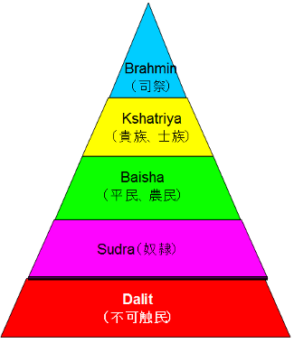 カースト制度は紀元前13世紀ごろ、北西から来たアーリア人が作った身分制度ですが、今なおインド社会に影響を与えています。カーストはバラモン、クシャトリア、ヴァイシャ、シュードラの四姓に区分され、カースト外にはダリット(不可触民)があります。各階級は、さらに2〜3千のジャーティー(職業)に分かれていて、とても複雑です。各職業は世襲され、家業として代々受け継がれますので、下層階級の人々はなかなか底辺から抜け出すことができないのです。また、違うカースト間の結婚はほとんど不可能です。異なるカースト間の結婚話があると、上位カーストの親が下位カーストの結婚相手を殺してしまうという事件すらあります。 |