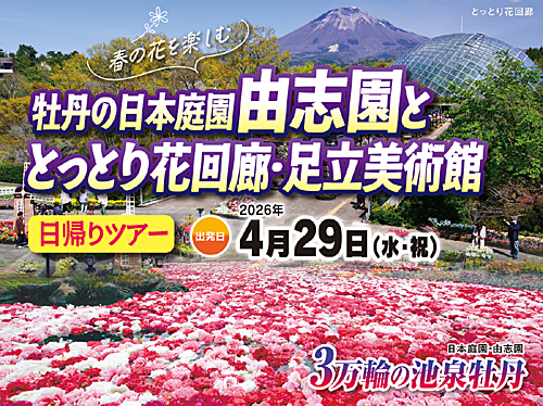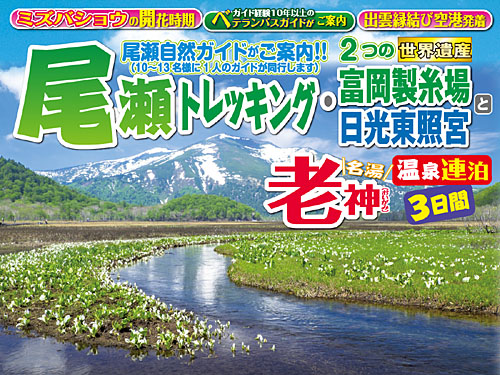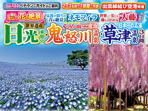 NEW 見渡す限りの青の絶景「ネモフィラ」・世界一美しい藤といわれる「大藤」見学と世界遺産日光東照宮・鬼怒川温泉・草津温泉3日間 出発日:①令和8年4月16日(木)②4月19日(日)③4月20日(月)④4月21日(火)⑤4月22日(水)⑥4月23日(木)⑦4月26日(日) 旅行代金:139,800円税込(国内線旅客施設使用料900円が別途必要です) ツアー詳細を見る(PDF)