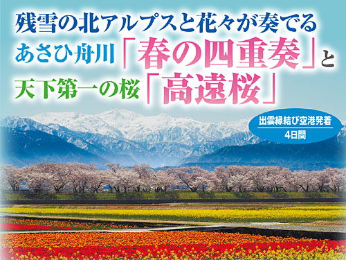 NEW 残雪の北アルプスと花々が奏でる あさひ舟川「春の四重奏」と天下第一の桜「高遠桜」4日間 出発日:令和8年4月9日(木)・4月13日(月) 旅行代金:129,800円(3~4名1室利用・税込) ツアー詳細を見る(PDF)